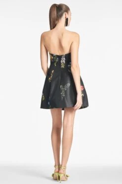 She is a sculpture articulated in our noir bouquet floral print! This ultimate strapless mini dress is engineered to keep her perfect bell shape. Boning at the bodice is what allows her to defy gravity. Embroidered flowers kiss the top of the dress disappearing into the bodice. We spent many hours on this frock to make sure she is exactly what you see on the site.