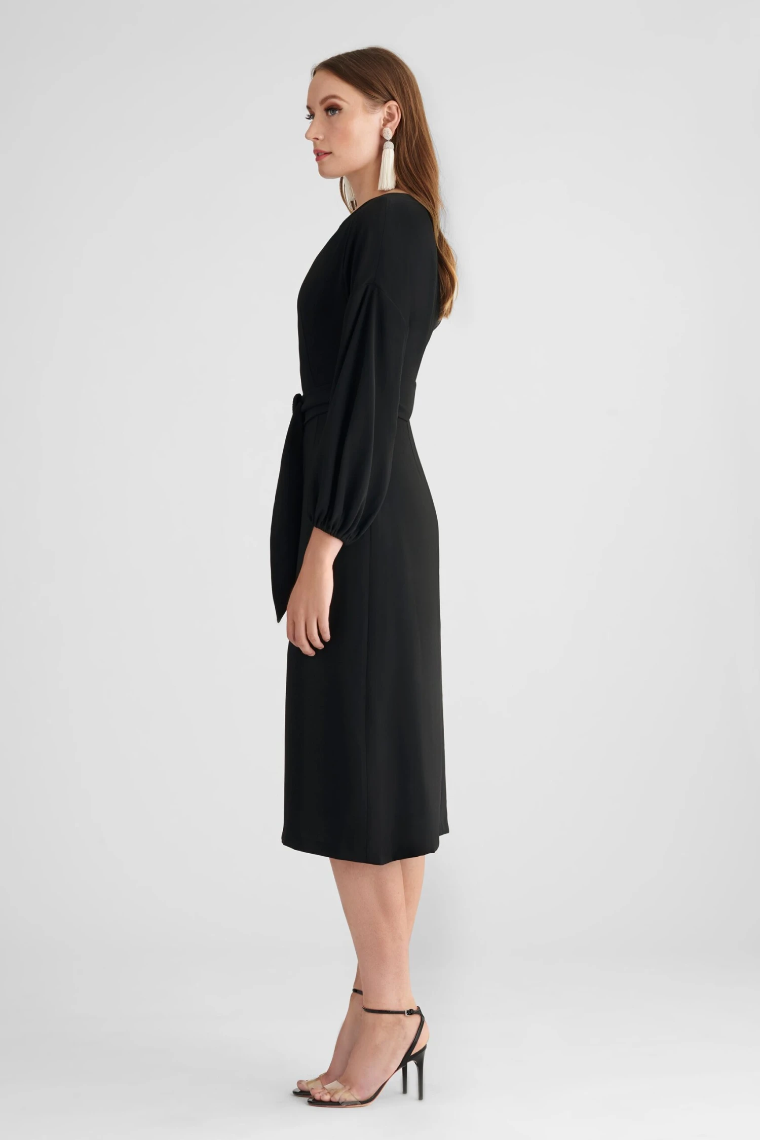 If ever there was a dress that could go anywhere it is Annie. The clean lines of this chic sheath are punctuated by an elegant and understated bracelet sleeve ruched at the cuff to create a subtle volume, center front slit, and self-sash. The lightweight crepe drapes elegantly and is considered an ideal 3 season fabric.