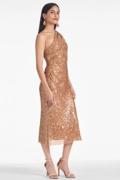 The Aubrey gown in amethyst is an example of balance by design. A sleek sleeve of charmeuse cut on the bias with an asymmetric seam at the waist creates a column for curves. At the shoulder sits a hand tucked collapsed bow adorned with hand-embroidered silver caviar beading at the knot.