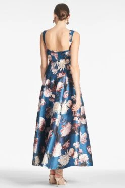 A classic simply put. Audrey is what was once referred to as a party dress before cocktail dresses became the common term. Her silhouette is an elegant fit and flare, and the neckline is a softly squared scoop. The fabric is what heirlooms are made of, the dress that no one forgets and is inevitably passed down. Featured in floral Mikado, it is nothing less than luxurious, the sweep of the skirt dramatic but flattering, and at back a discreet bow is the final detail to complete the dress.