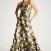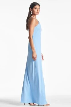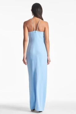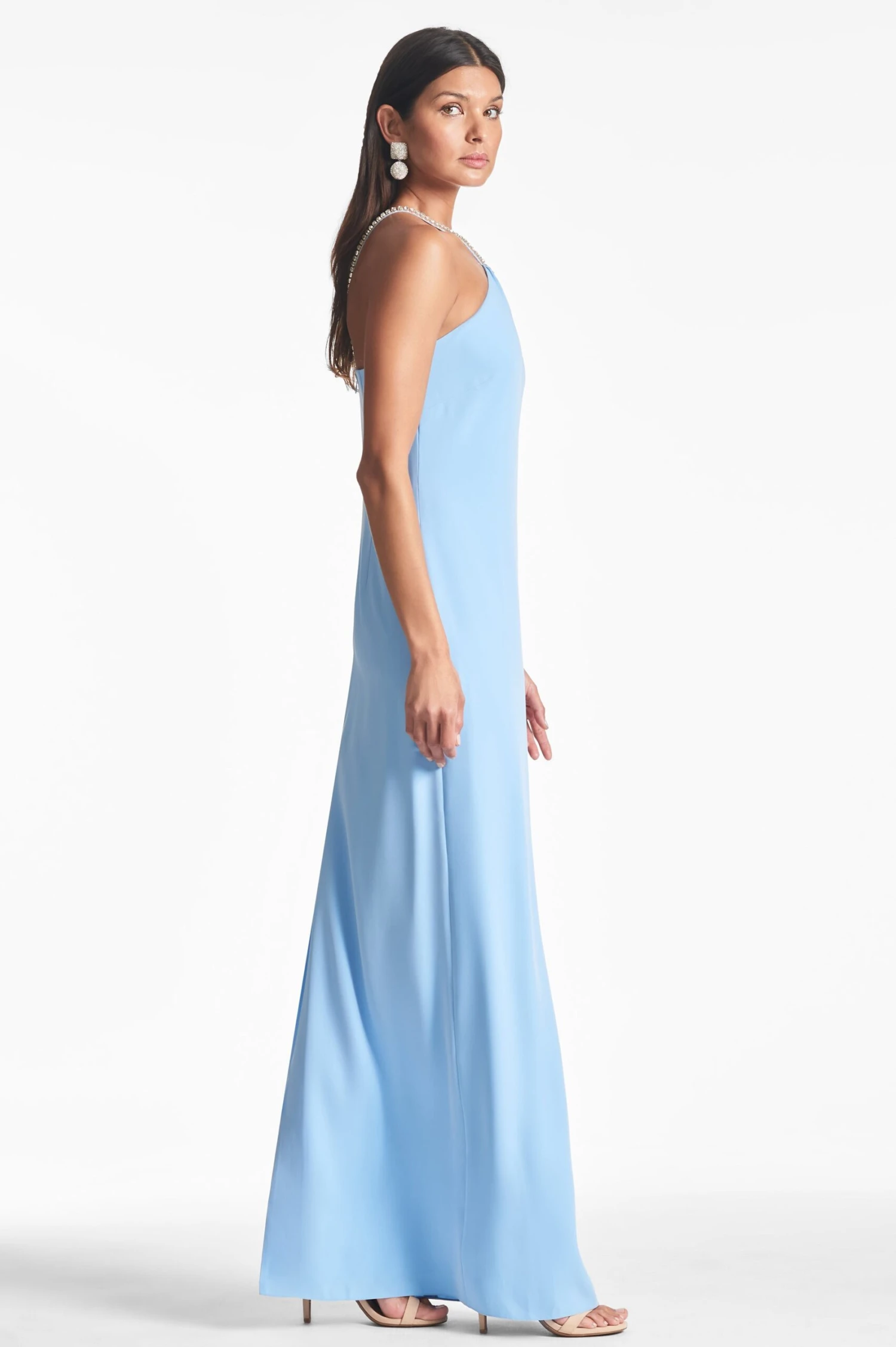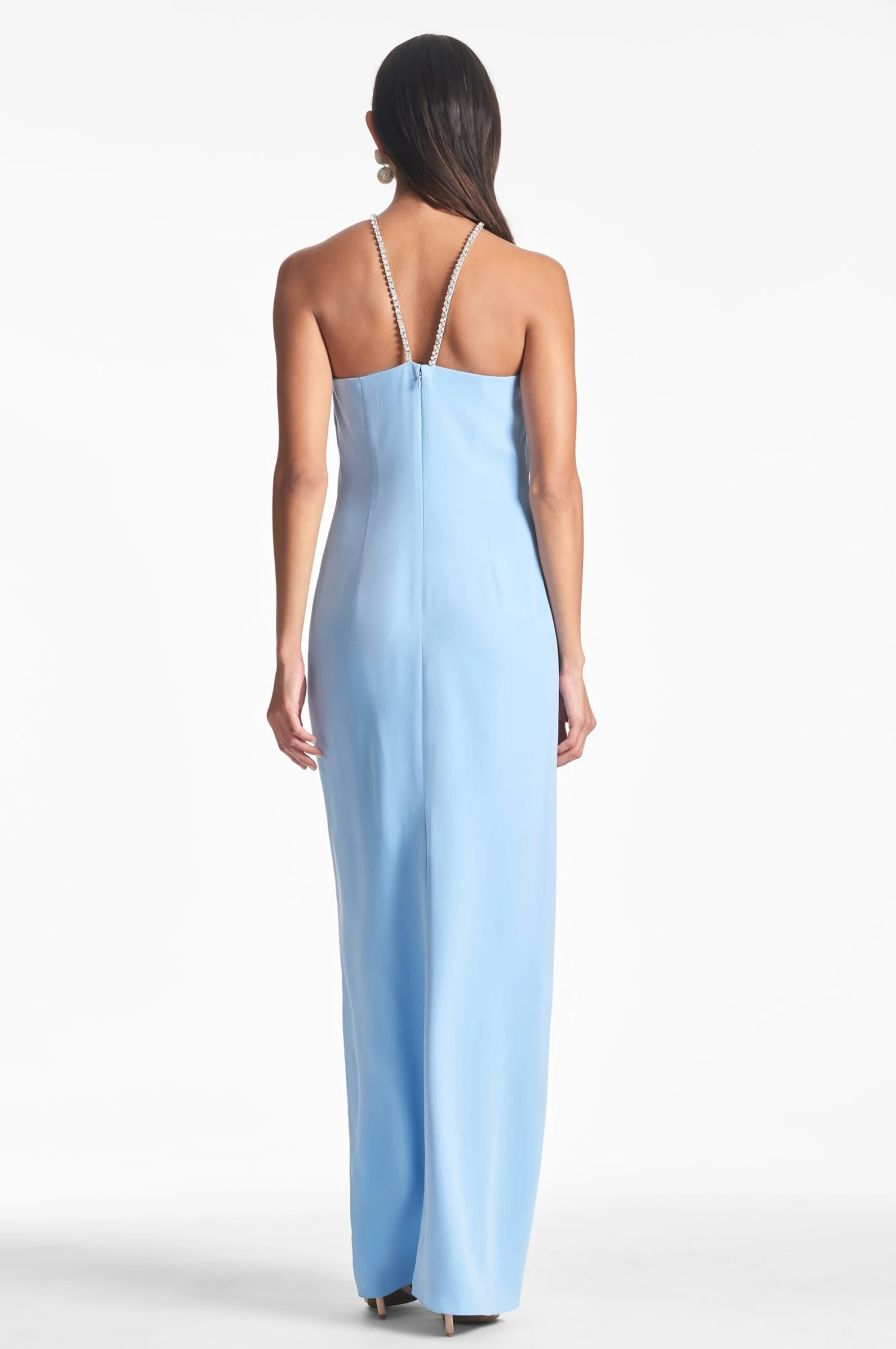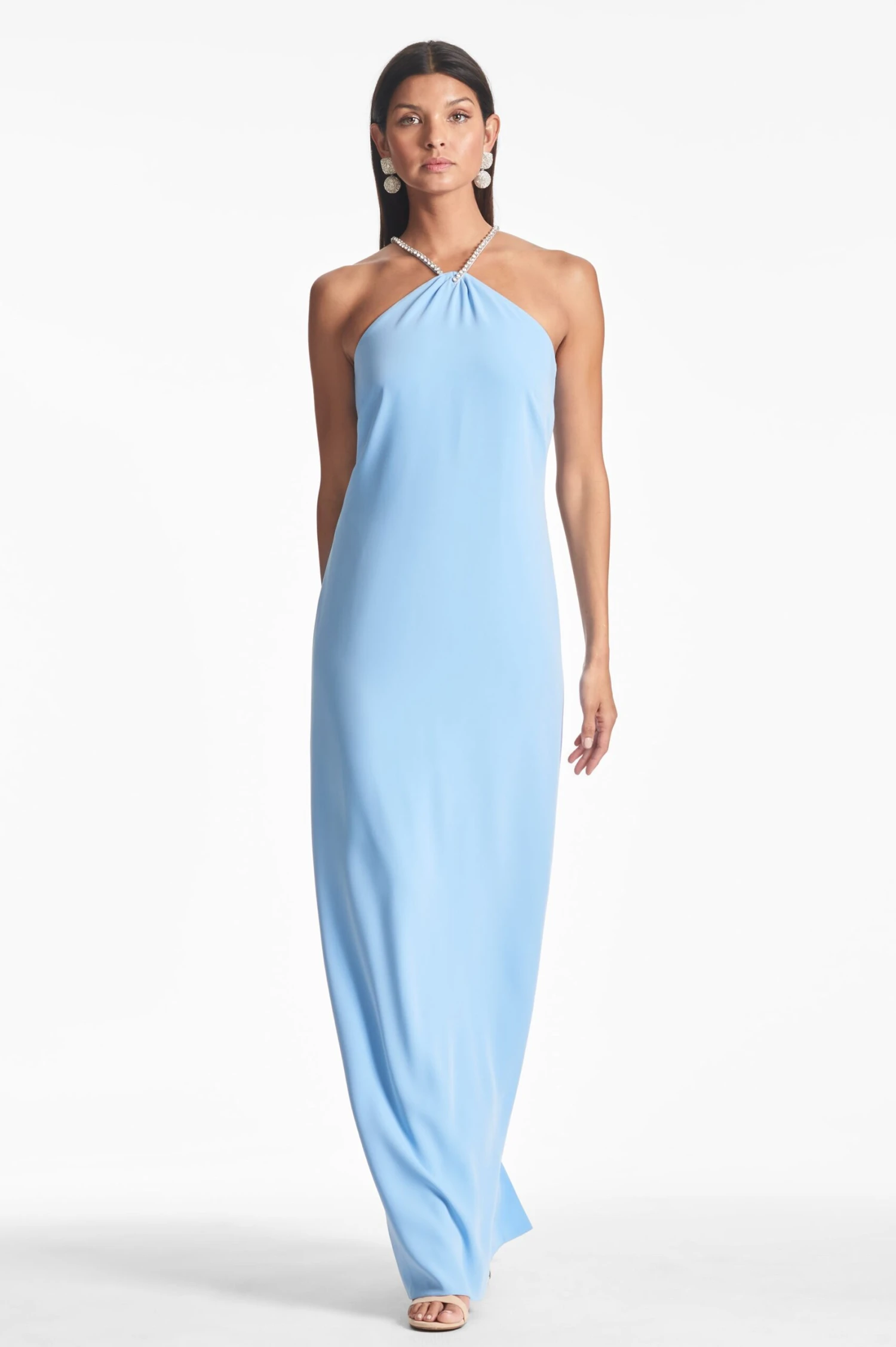 Becca is a classic column gown in our beloved stretch crepe. A jeweled halter neckline that acts as a beautiful necklace and creates a very flattering ruched detail at the front accentuating the lines of the bodice. The clean aesthetic of this otherwise unassuming silhouette creates a flattering long, lean line. She is the ultimate spring/summer gown, perfectly unaffected, easy, and elegant.