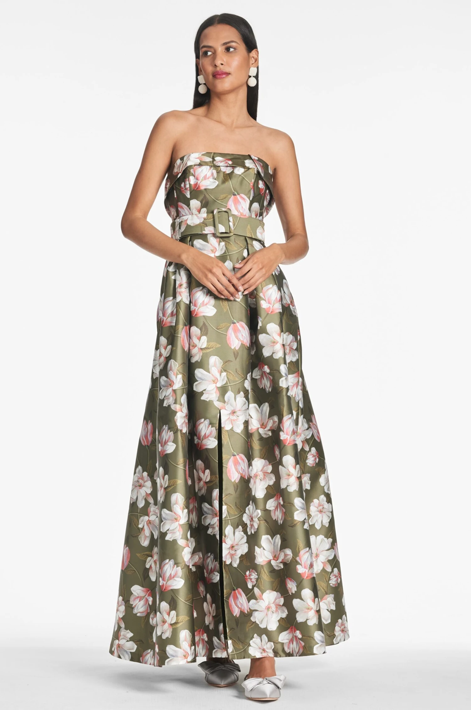 The Brielle gown is a vision in our uniquely romantic magnolia floral print. The otherwise classic strapless silhouette has a specially designed envelope fold to add a bit of architectural interest.