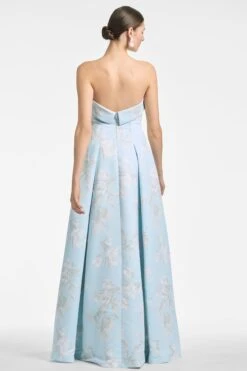 The Brielle gown is a vision in our uniquely romantic venetia petal print in sky blue. The otherwise classic strapless silhouette has a specially designed envelope fold to add a bit of architectural interest.