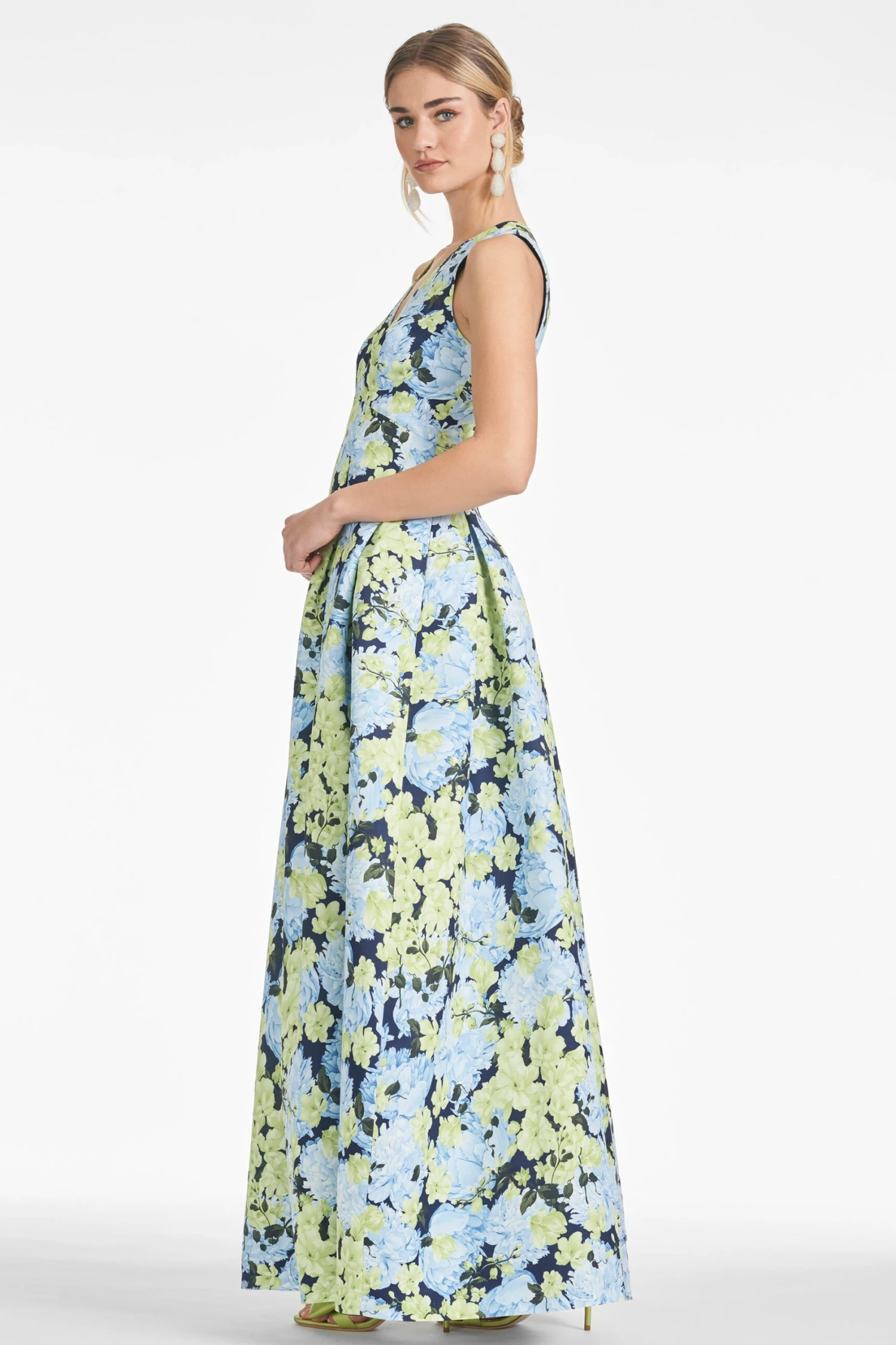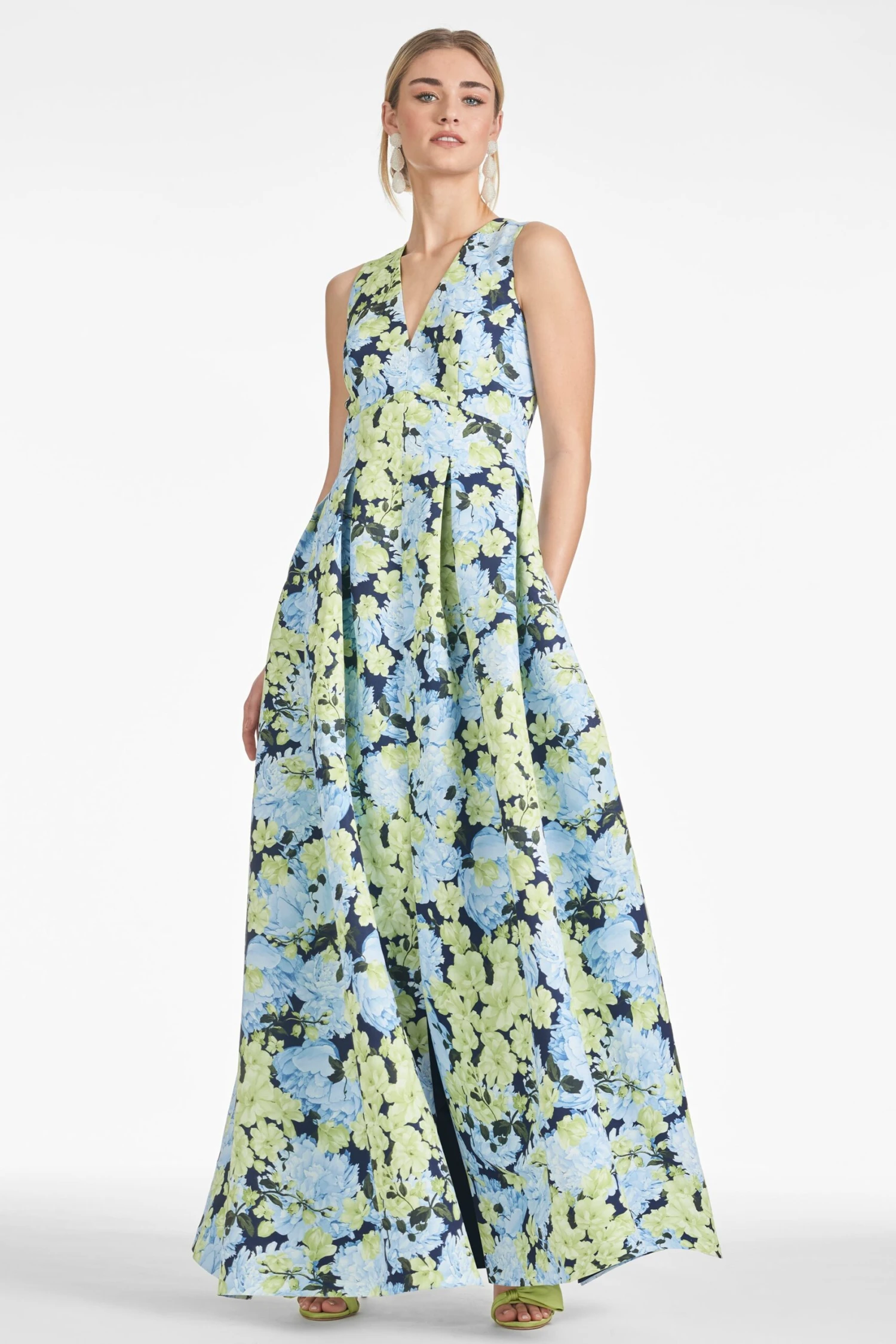 The Brooke is our V-neck gown with box pleats, peaked waist seam, and side pockets. This dress is what we consider to be a classic, essential silhouette, a perfect canvas for our most breathtaking prints. This one is featured in Garden Club, a combination of hydrangea and magnolias in the most gorgeous combinations of green, blue, and black.