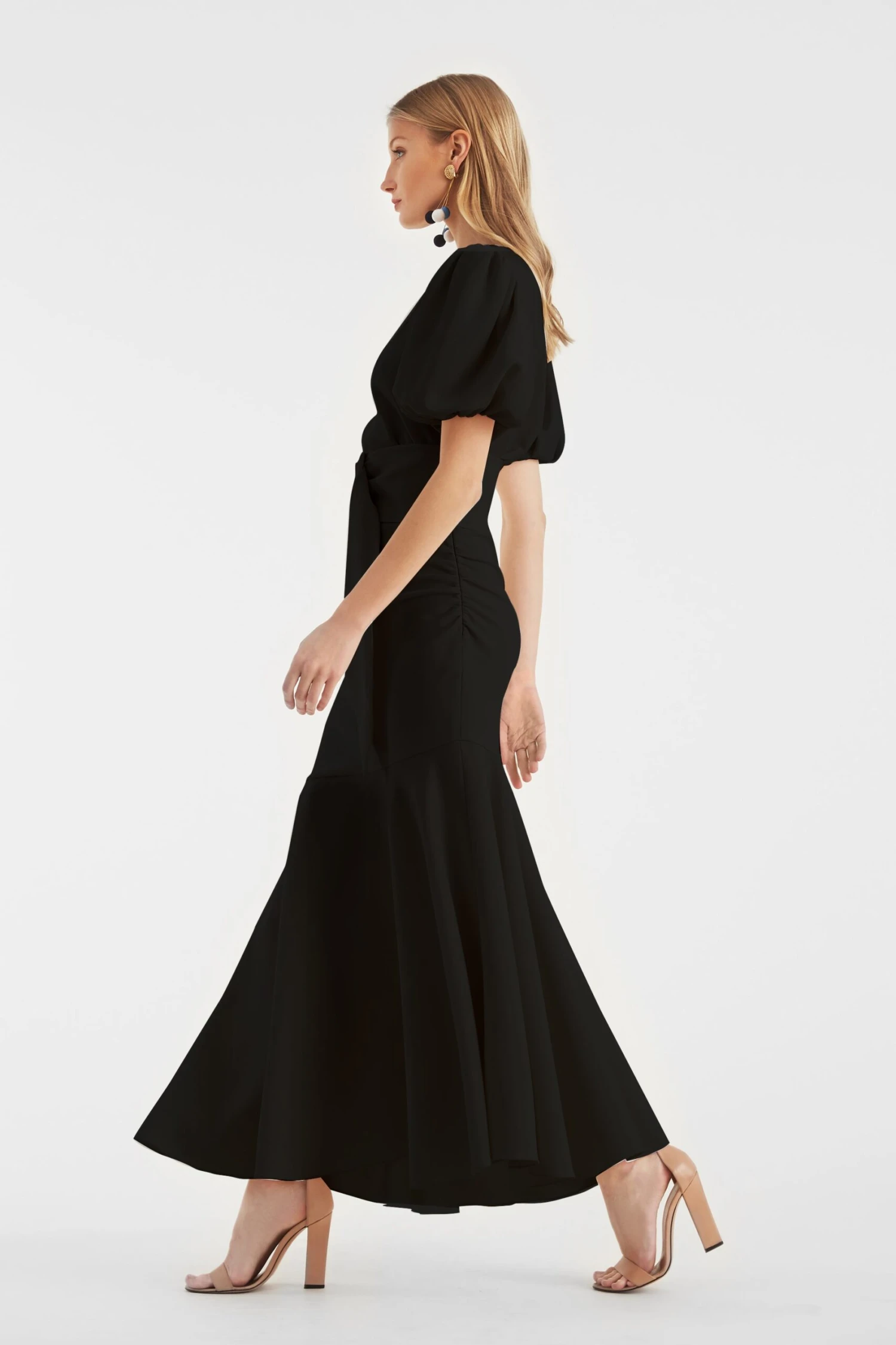 The Camilla dress in crepe is a modified mermaid silhouette perfect for day to evening. Ruching at the jewel neck creates a subtle blouson, and the bodice features a self-belt with hand wrapped buckle. Ruching is also seen at the side to hug the hip, falling away from the body with a fluid asymmetric hem. Â