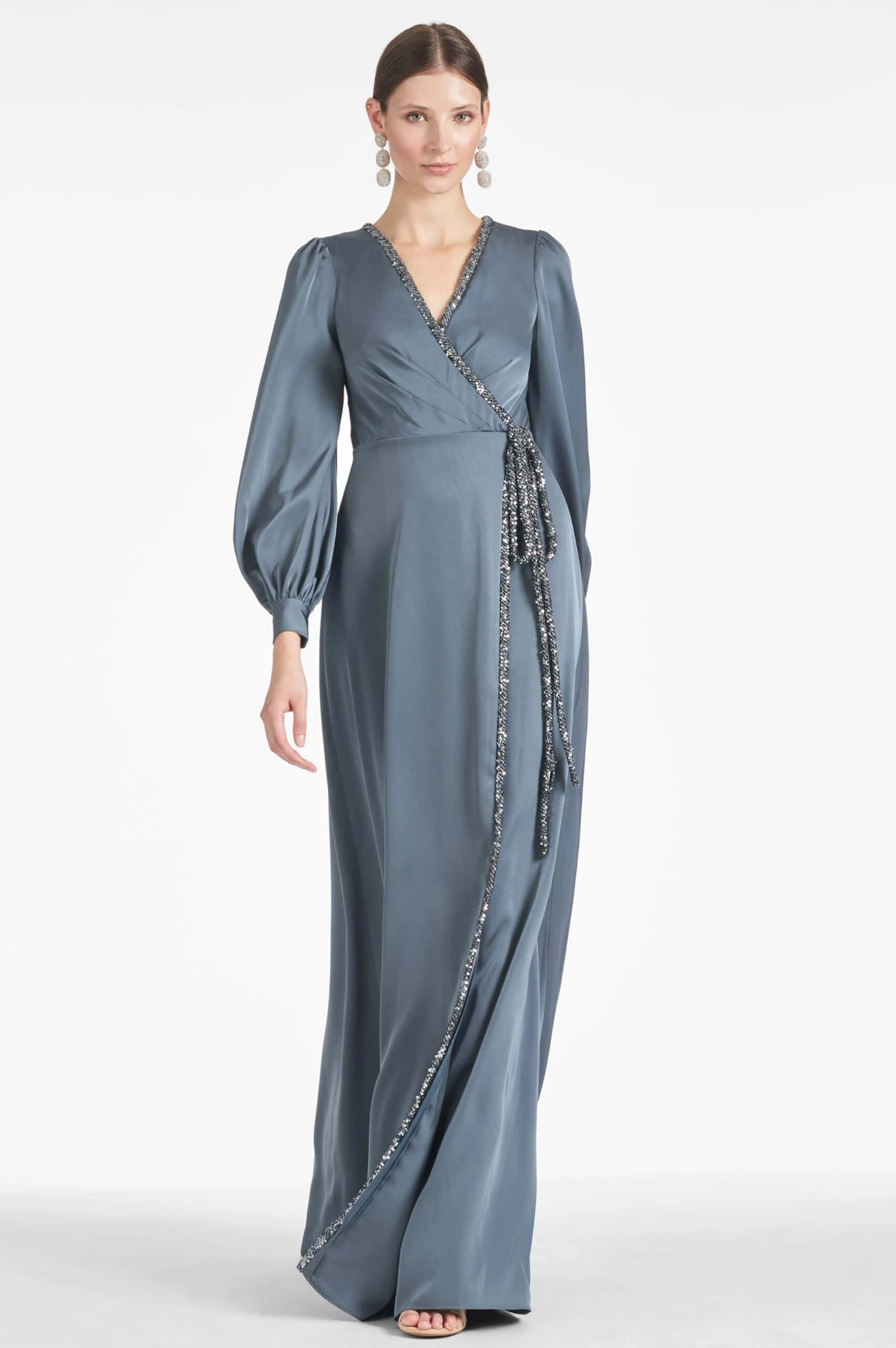 The Dorthea Gown is a stunning gunmetal A-line gown with subtle sparkle accents. Crafted from a soft satin crepe fabric, the gown features long sleeves and an elegant drape for the ultimate sophistication at any event.