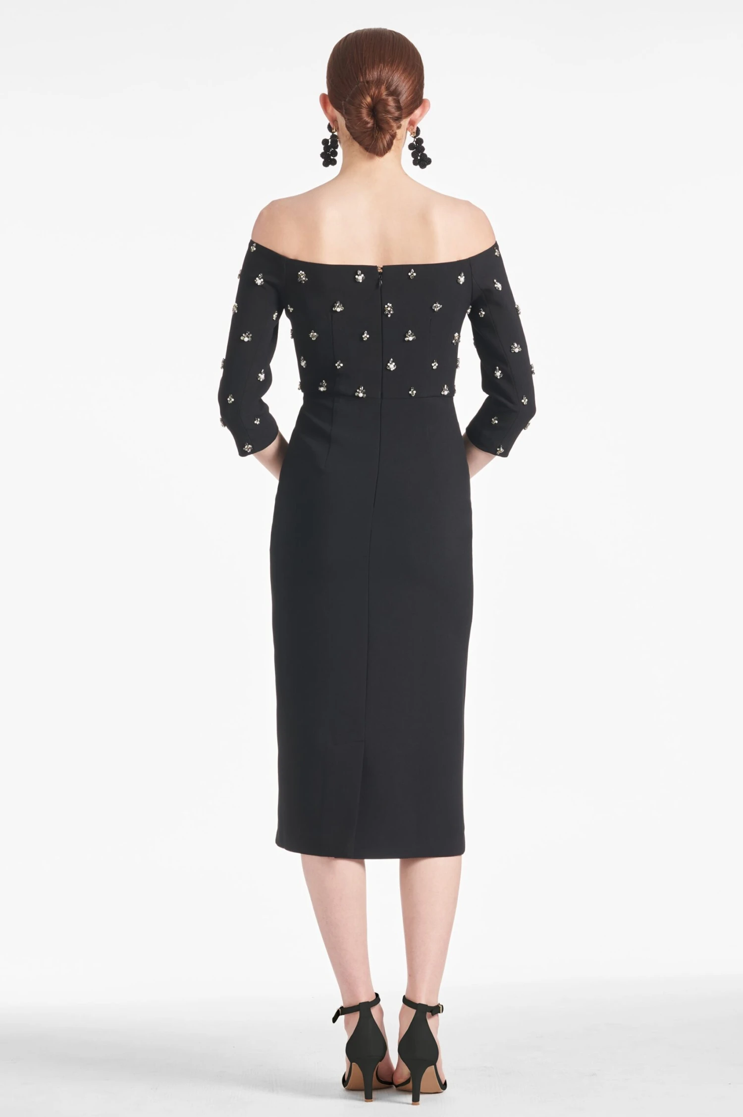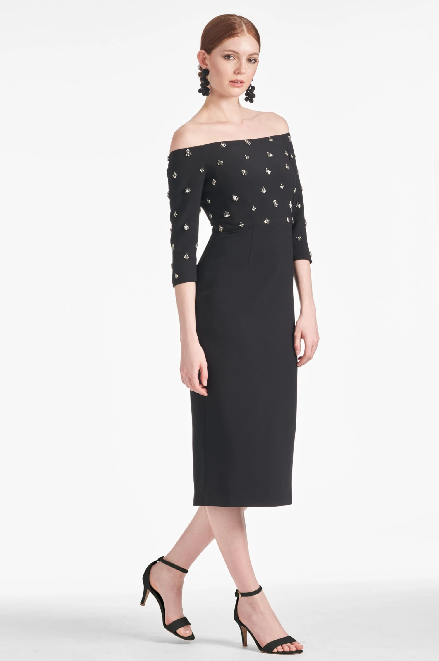 This timeless classic, the Fatima Dress, is crafted from stretch crepe black fabric, boasting an elegant off-the-shoulder design with tasteful minimal embellishments for a subtle touch of sophistication. She’s an exquisite look that goes beyond the traditional LBD.