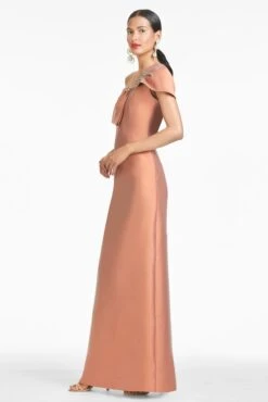 Wrapped in a sleeve of stretch Mikado, the Ines column gown glides over the form to create a clean and subtly sexy silhouette. At one shoulder a swath of Mikado is fashioned into a sculptural sash, adorned with crystals, reminiscent of an heirloom broach.