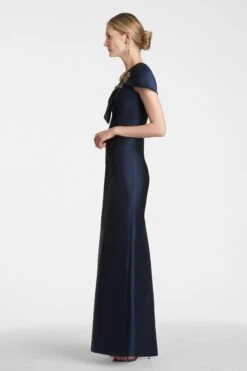 Wrapped in a sleeve of double face twill stretch Mikado, the Ines column gown glides over the form to create a clean and subtly sexy silhouette. At one shoulder a swath of Mikado is fashioned into a sculptural sash, adorned with crystals, reminiscent of an heirloom broach.