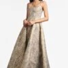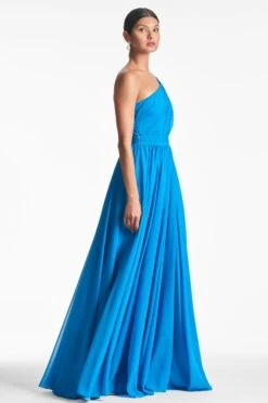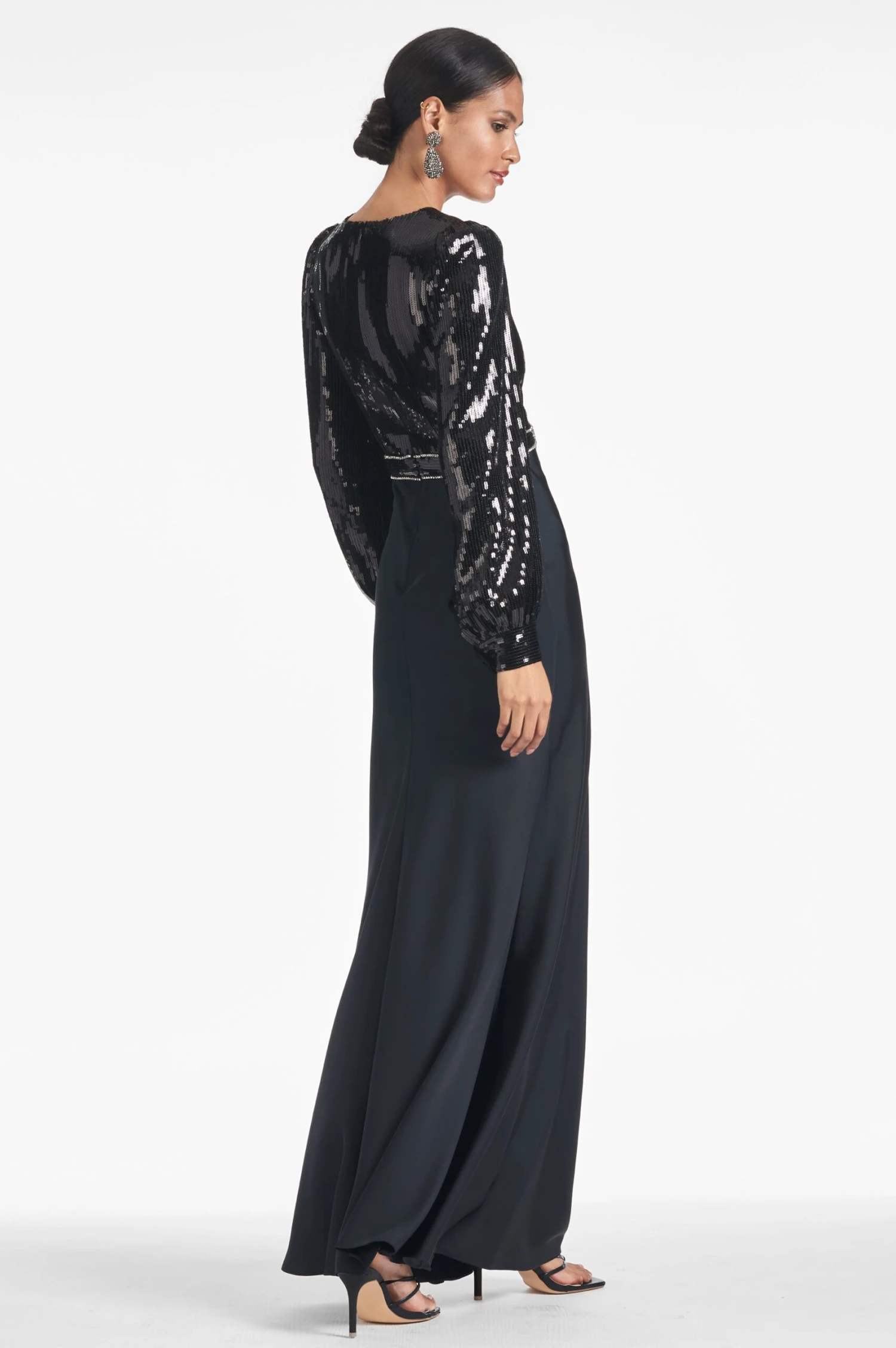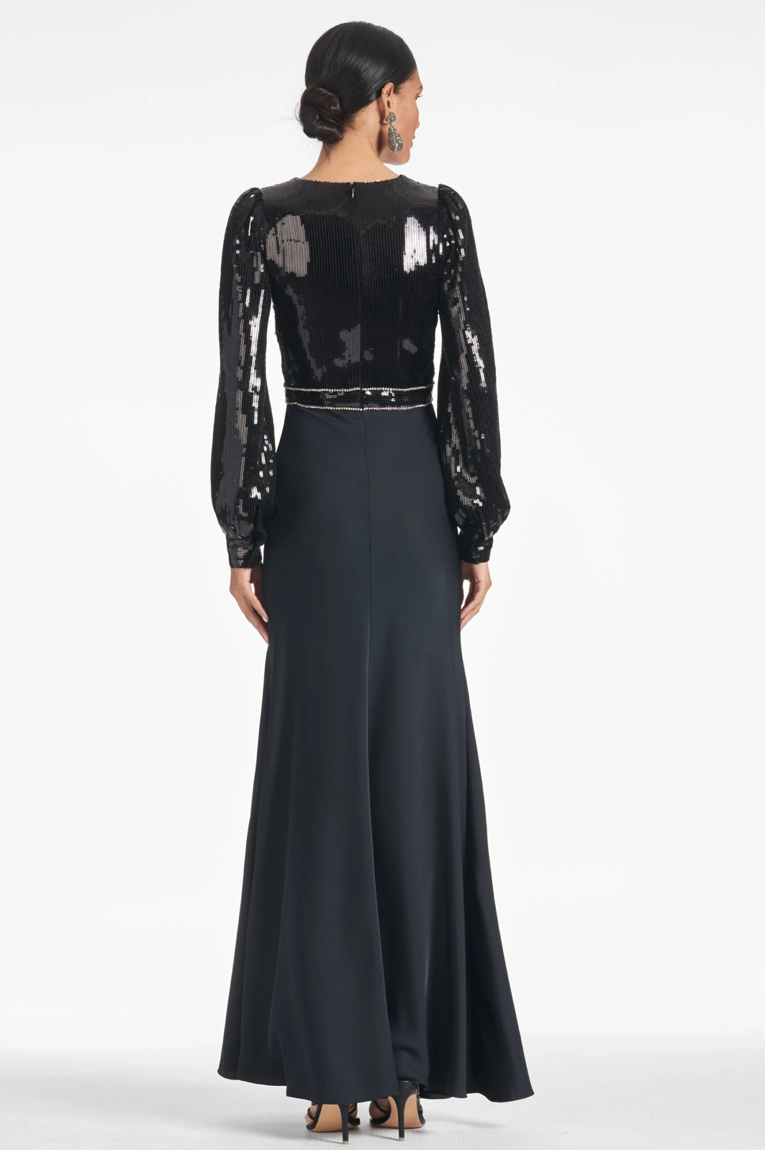 The Lane Gown in black features a combination of satin crepe and shining sequins for a luxurious look. The bow detail adds fun and extra visual interest to the already stunning design. Perfect for formal events, this gown is sure to make a statement.