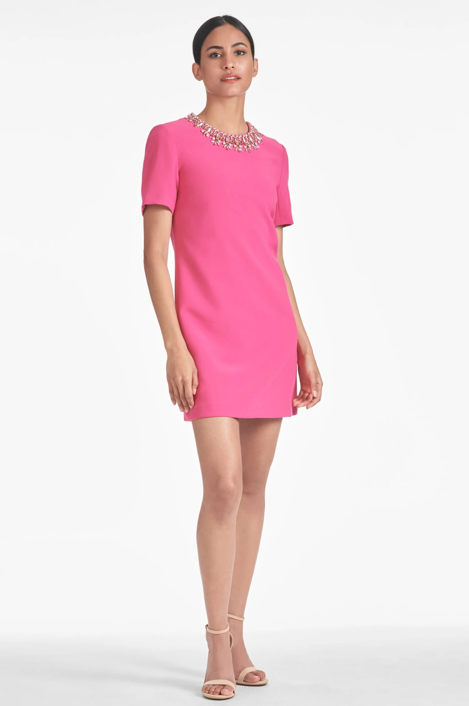 The Lauren Dress is a perfect staple. Its rose pink color and short sleeve design make it ideal for day to night transition. The mini dress features an embellished neckline which adds a sophisticated touch, wearable for any occasion. A must-have for any wardrobe, this dress is delicate, feminine, and flattering.