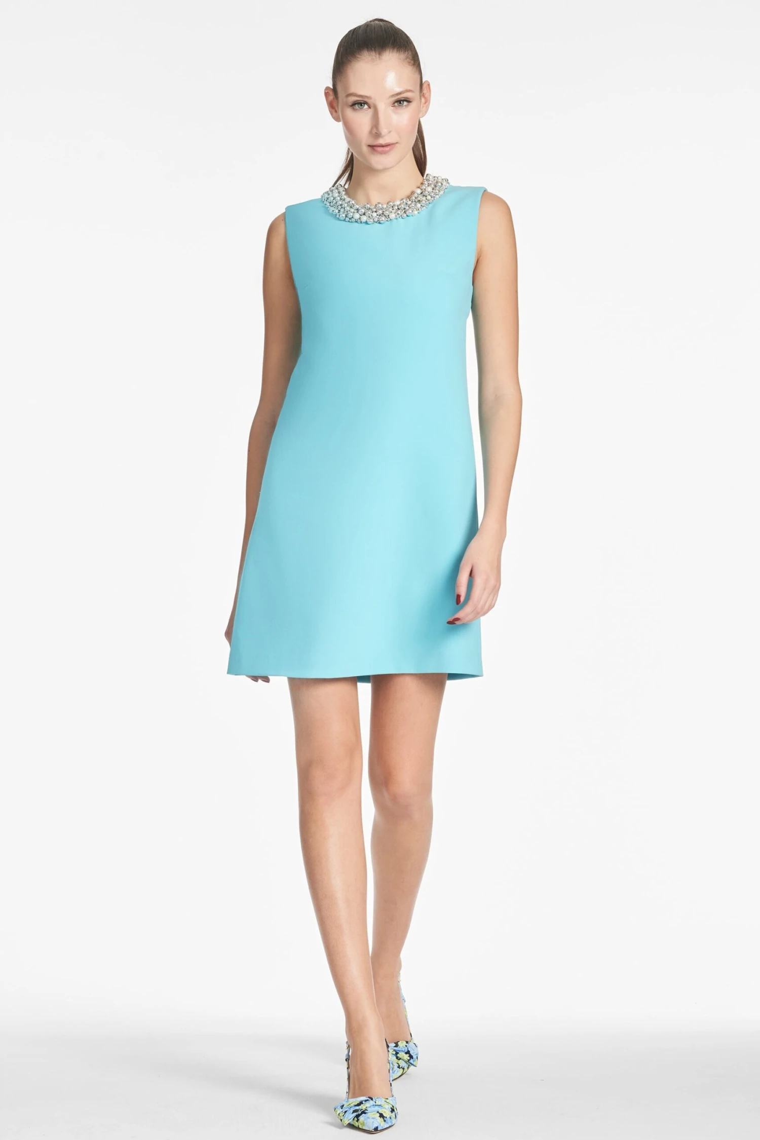 Palm Beach calling… It doesn’t get much cuter than the Liz. She’s our sleeveless mini dress in Swiss Blue sure to make a statement. Made of thick stretch crepe with pearl, and silver bead embellishment at the collar, this one can be dressed up or down all year long.
