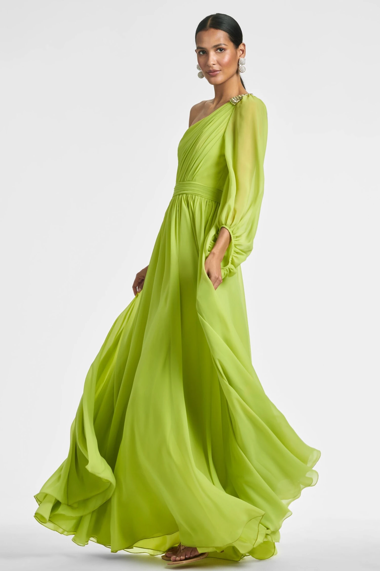 Make a statement in our Makayla Gown. Featuring a one-shoulder design and diagonal rouching at the bodice with a banded waist, this stunning chartreuse gown is perfect for any special occasion. The crystal-embellished broach adds a touch of glamour to complete the look.