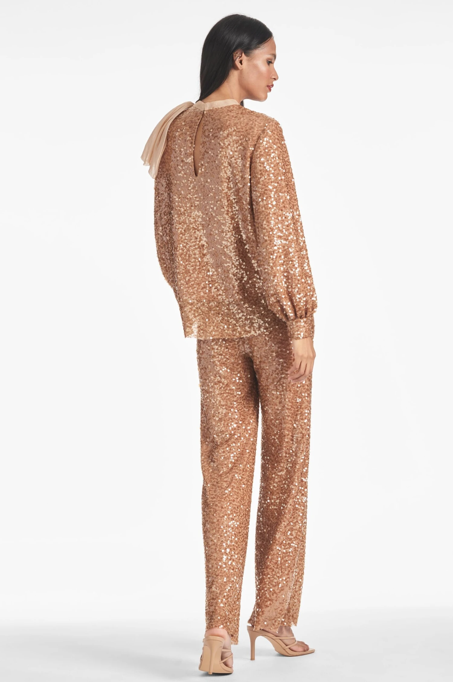 This long sleeve top is crafted with shimmery sequins for a sparkle and shine you will love with an oversized organza bow on the shoulder. The perfect party-ready piece, it’s a must-have addition to your wardrobe for any special occasion. With a coordinating set of bottoms, you’ll sparkle in this unique set.