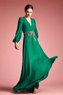 Look radiant in the Ramsey Gown! Featuring a stunning a-line silhouette, this gorgeous malachite green gown has three-quarter sleeves and an embellished bow detail at the waist for a look that is both elegant and eye-catching. Perfect for any mother of the bride or groom, wedding guest or special occasion.