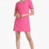 The Rue Dress is perfect for any season. Crafted from pink cloque, this mini dress has short sleeves and a belted waist. It’s the perfect cute look for work, dinner, or a party, and can be styled in many different ways.