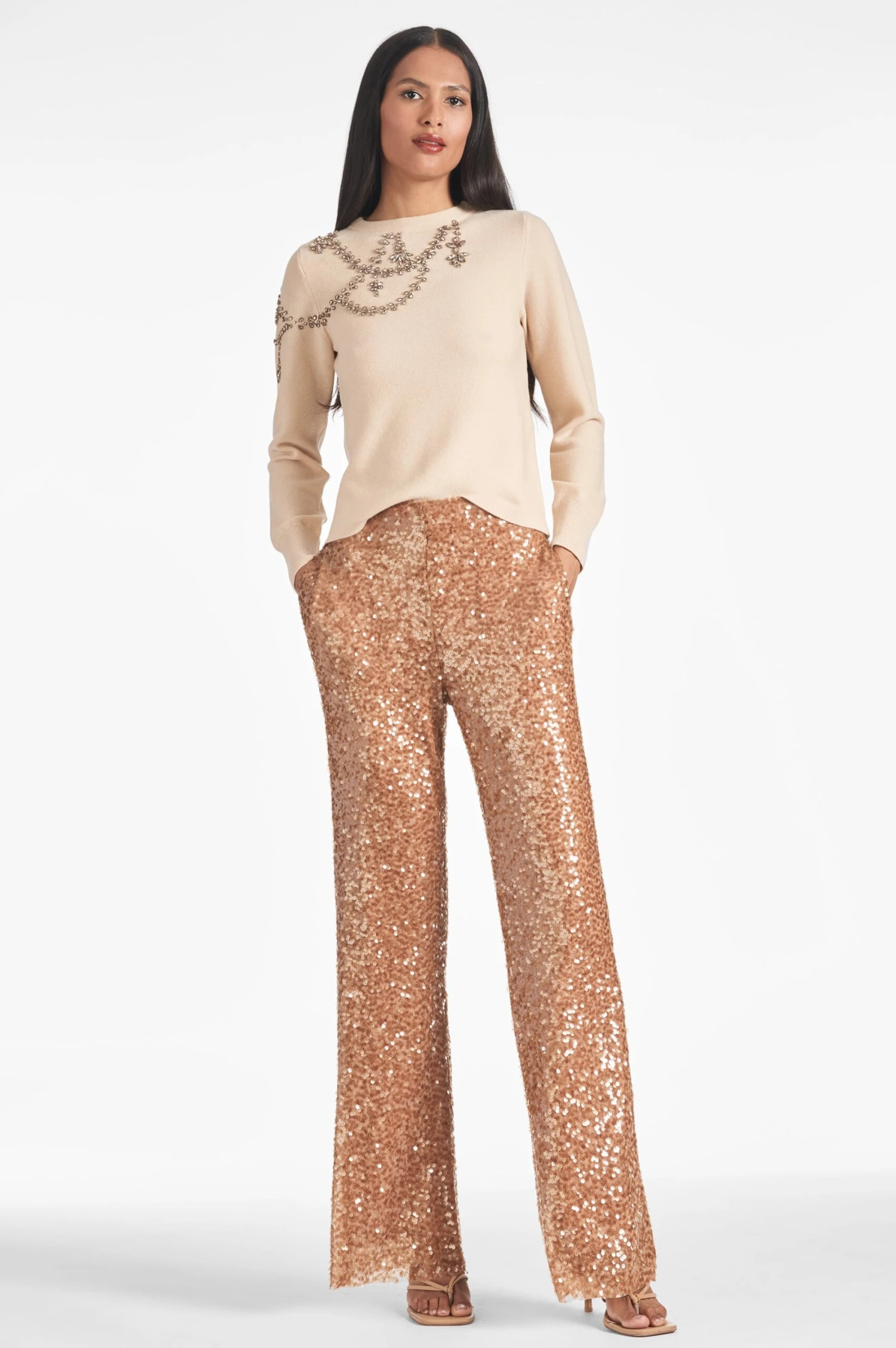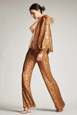 Our Sequin Bri Pant in Honey is the perfect addition to a matching set when combined with Marlena Top. With its dazzling sequins and sparkles and comfortably stylish, you’ll love wearing this set all night long.