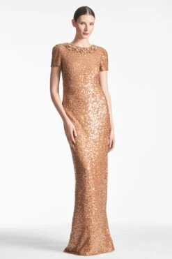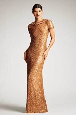 The Shiloh Gown is a gorgeous vision of luxury. A classic column cut with intricate embellishment at the neckline accented with glimmering sequins exude sophistication and elegance. The lovely honey color complements all skin tones, while the short sleeve coverage offers a timeless look with a modern statement. Make your next event unforgettable in the Shiloh Gown.